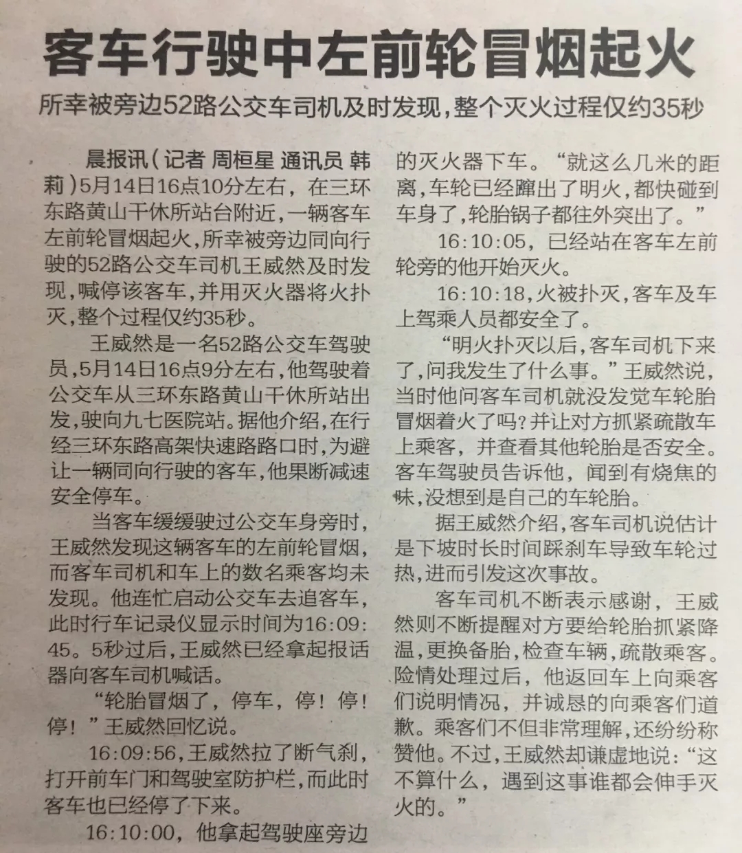 5月14日16點(diǎn)10分左右,在三環(huán)東路黃山干休所站臺附近,一輛客車左前輪冒煙起火,所幸被旁邊同向行駛的52路公交車司機(jī)王威然及時發(fā)現(xiàn),喊停該客車,并用滅火器將火撲滅,整個過程僅約35秒。